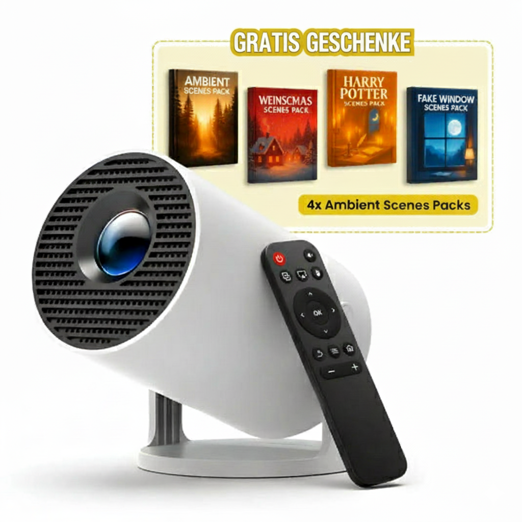 Der BeyondWalls Projektor enthält kuratierte Fantasie-Fenster und atmosphärische Szenen – sofort einsatzbereit.